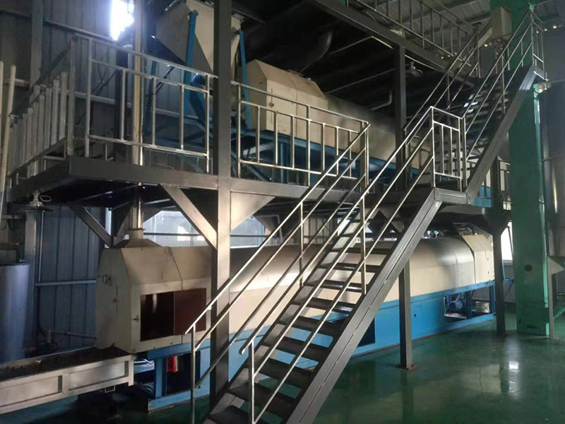 我們解決其技術問題所采用的技術方案是:一種新型環保節能熱風炒爐,由電源供電,包括第一燃燒室、第二燃燒室、熱風炒爐滾筒、存料機、自動喂料器、出料機、引風機和排潮風機,所述熱風炒爐滾筒的入口端通過自動喂料器與所述存料斗連通,所述熱風炒爐滾筒的入口端還通過風道與所述排潮風機連通,所述熱風炒爐滾筒的出口端與出料機連通,所述第一燃燒室和第二燃燒室通過風道與引風機連通,所述第一燃燒室和第二燃燒室分別位于所述熱風炒爐滾筒的下方,所述熱風炒爐滾筒軸心線與水平面形成2°到8°的夾角,所述第一燃燒器和第二燃燒器安裝位置在相應燃燒室的前端或者相應燃燒室的兩個側面。我們設備取消了原熱風炒爐所配套的單獨熱風爐、彎段風道或直段風道;在炒爐滾筒下方設計安裝兩份熱風燃燒室,用燃燒器產生的熱風直接對滾筒進行加熱,最大限度地縮減了炒爐散熱環節和面積,從而實現炒爐連段式加熱。與現有設備相比,我們公司設備充分利用了熱風釋放的熱量,減少了熱量損失,單噸油料或糧食加工消耗添人氣甚至能降低到25nm3,降低了17%,節能降耗效果非常明顯,得到了客戶的一致好評。與現有設備相比,同等日加工量,所配兩臺燃燒器合計功率比現有設備燃燒器功率下降20%-30%,熱風設定溫度有750-800℃下降到400-500℃,明顯延長了炒爐的使用壽命。第一燃燒室和第二燃燒室的功能各不相同,工作溫度也不一致,第一燃燒室和第二燃燒室能夠實現分段加熱溫度控制,更加靈活與合理,安全可靠,便于操作與控制。